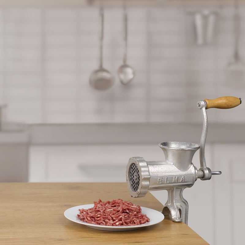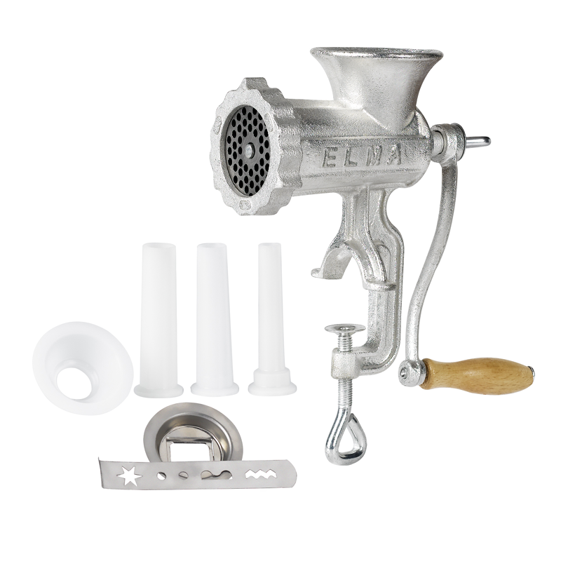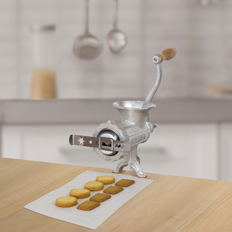 Las picadoras tienen la función de embutidoras, acoplando el set de embudos. Además disponemos de cuchillas y placas de distintas dimensiones. Incluye accesorio galletas. Fabricadas en hierro fundido. Tratamiento superficial: baño electrolítico. Cuchillas y placas de carbono fabricadas en acero estampado y templado. Función de embutidora acoplando el set de embudos. Pack de accesorios incluidos: Placa de acero al carbono de Ø5 mm; Cuchilla de acero al carbono; Set de embudos: Ø 15/20/22 y 90 mm de largo.