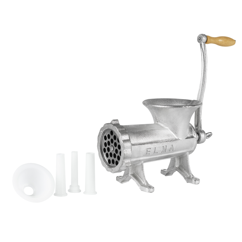 ELMA PICADORA MANUAL Nº 32 (FUNDICIÓN - SUJECIÓN TORNILLO). Fabricadas en hierro fundido. Tratamiento superficial: baño electrolítico. Cuchillas y placas de carbono fabricadas en acero estampado y templado. Función de embutidora acoplando el set de embudos. Pack de accesorios incluidos:Placa de acero al carbono de Ø12 mm; Cuchilla de acero al carbono; Set de embudos: Ø 15/20/22 y 90 mm de largo