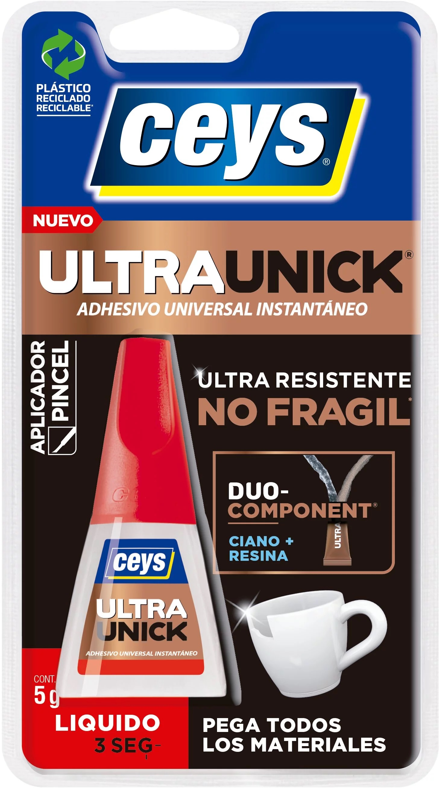 UNION ULTRA RESISTENTE 100% INVISIBLE COMPONENTE ANTI-FRAGIL 1 GOTA 3 SEGUNDOS ULTRAUNICK LIQUIDO es el adhesivo universal instantáneo ultra fuerte, ultra rápido y seguro. Proporciona una unión invisible en 3 segundos*. Pega todos los materiales**. Resiste golpes . Sin olor, no irritante. Ideal para uniones invisibles; acabados 100% transparentes y no blanquea. *Dependiendo de los materiales a pegar.Materiales: Porcelana, madera, metal, goma, plástico, cuero, cartón etc. **No indicado para Polietileno (PE), polipropileno (PP), PTFE.