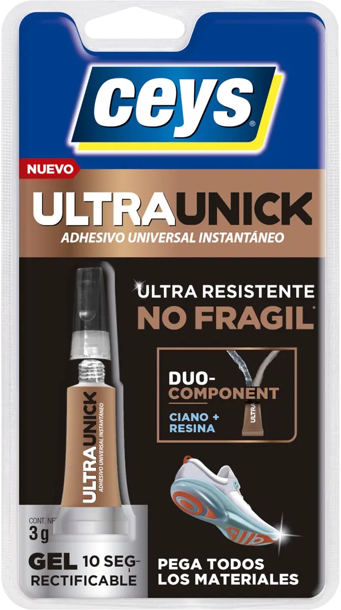 PEGAR Y FIJAR. ULTRA RESISTENTE UNIÓN NO FRÁGIL. CEYS ULTRAUNICK GEL es el adhesivo universal instantáneo NO FRAGIL, ultra fuerte, ultra rápido y seguro. Proporciona una unión perfecta en 10 segundos*. Pega todos los materiales**. (* Dependiendo de los materiales a pegar. **No indicado para Polietileno (PE), polipropileno (PP), PTFE.). La nueva tecnología DUO-COMPONENT une la fuerza del ciano con la flexibilidad de la resina aportando adaptabilidad a la unión. Ultra resistente. Rectificable.Resiste golpes y vibraciones.No irritante, bajo olor.Resiste agua, exterior y lavavajillas