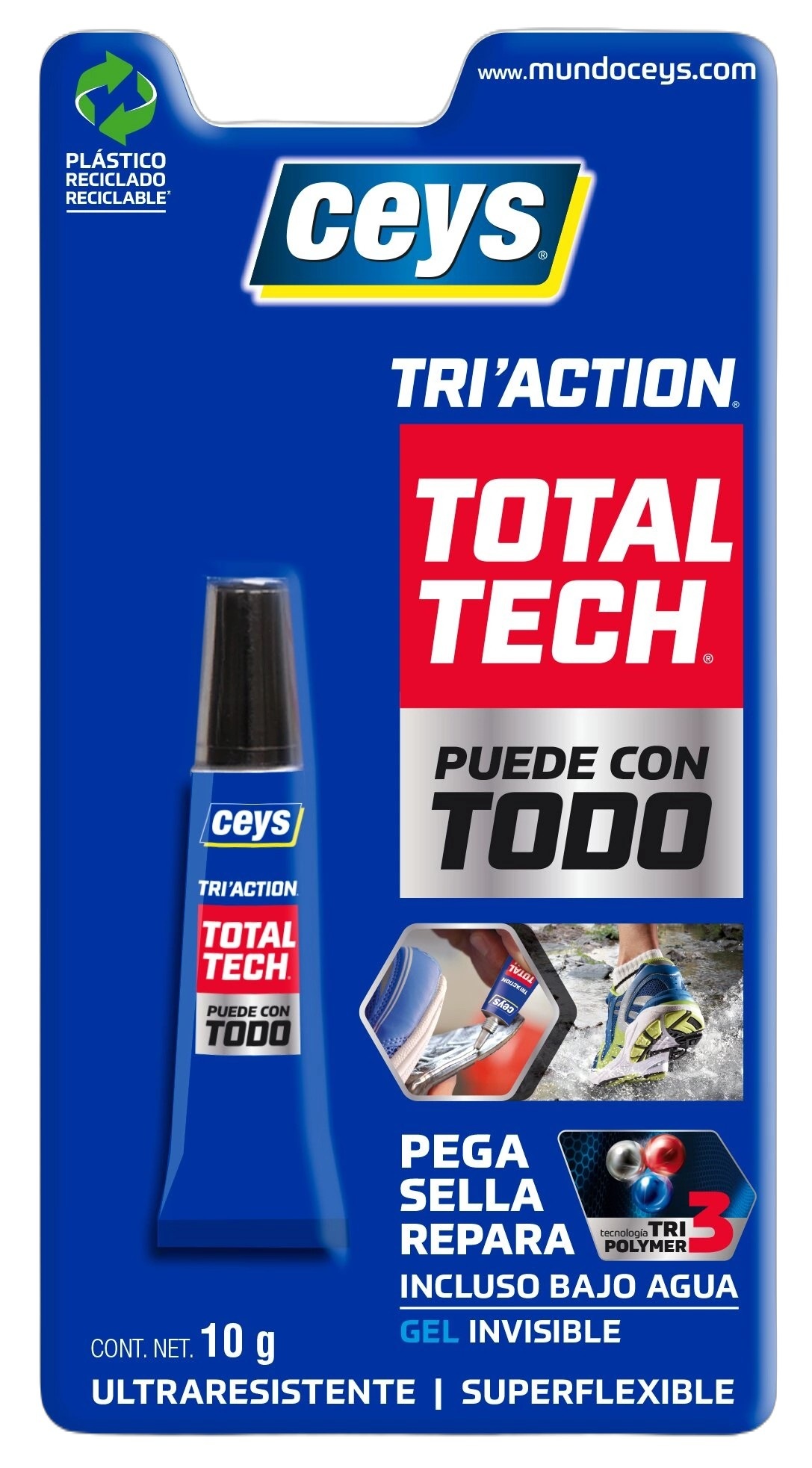 Ceys TRIACTION con tecnología TRIPOLYMER es un producto 3 en 1: Pega, sella y repara cualquier material en cualquier situación, resistiendo a las condiciones más duras. Ultra resistente, flexible y 100% hermético.Características Máxima Polivalencia. Pega, sella y repara todo tipo de materiales. Exento de disolventes; no ataca las superficies.Ultra resistente. Extraordinaria resistencia a la intemperie (-50ºC a +120ºC), al envejecimiento y a los rayos UV. Resistente al moho y al agua. Super Flexible. Permite uniones flexibles y juntas elásticas. Materiales:Hormigón, ladrillo, metales, mármol, madera, teja, galvanizados, plásticos, espejos, cemento, terracota, pizarra, PVC, ABS metacrilato, aluminio, policarbonato, porex, goma