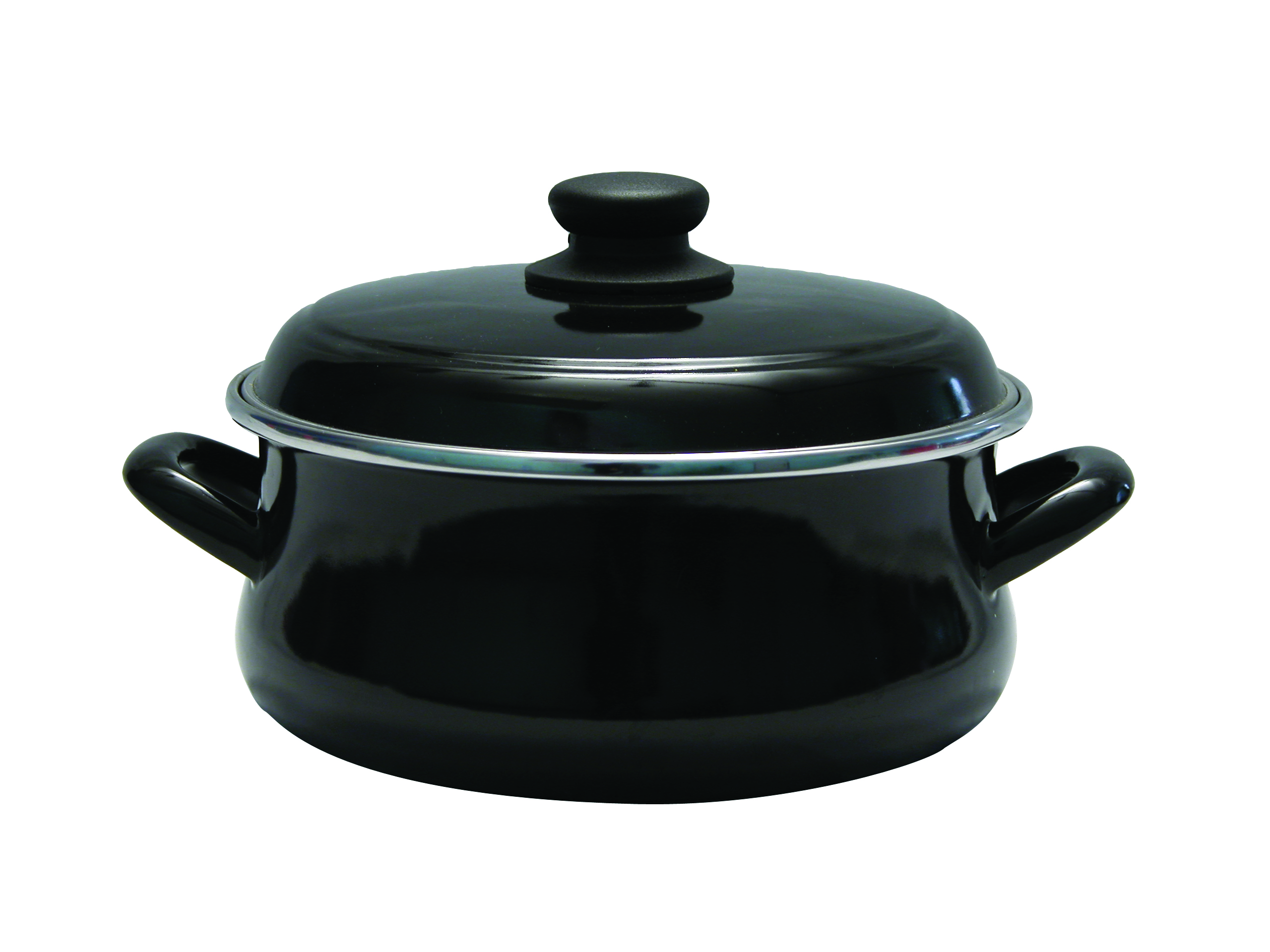 Acero esmaltado vitrificado. Color exterior negro. Tapas de acero esmaltado vitrificado. Mangos baquelita. Recubrimiento interior antiadherente bicapa. Piezas válidas para topo tipo de fuegos.
