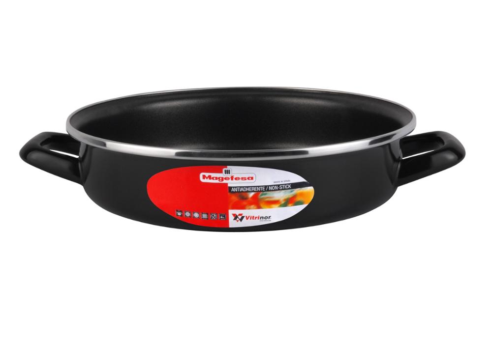 Acero esmaltado vitrificado. Color exterior negro. Mangos baquelita. Recu- brimiento interior antiadherente bicapa. Piezas válidas para todo tipo de fuegos.