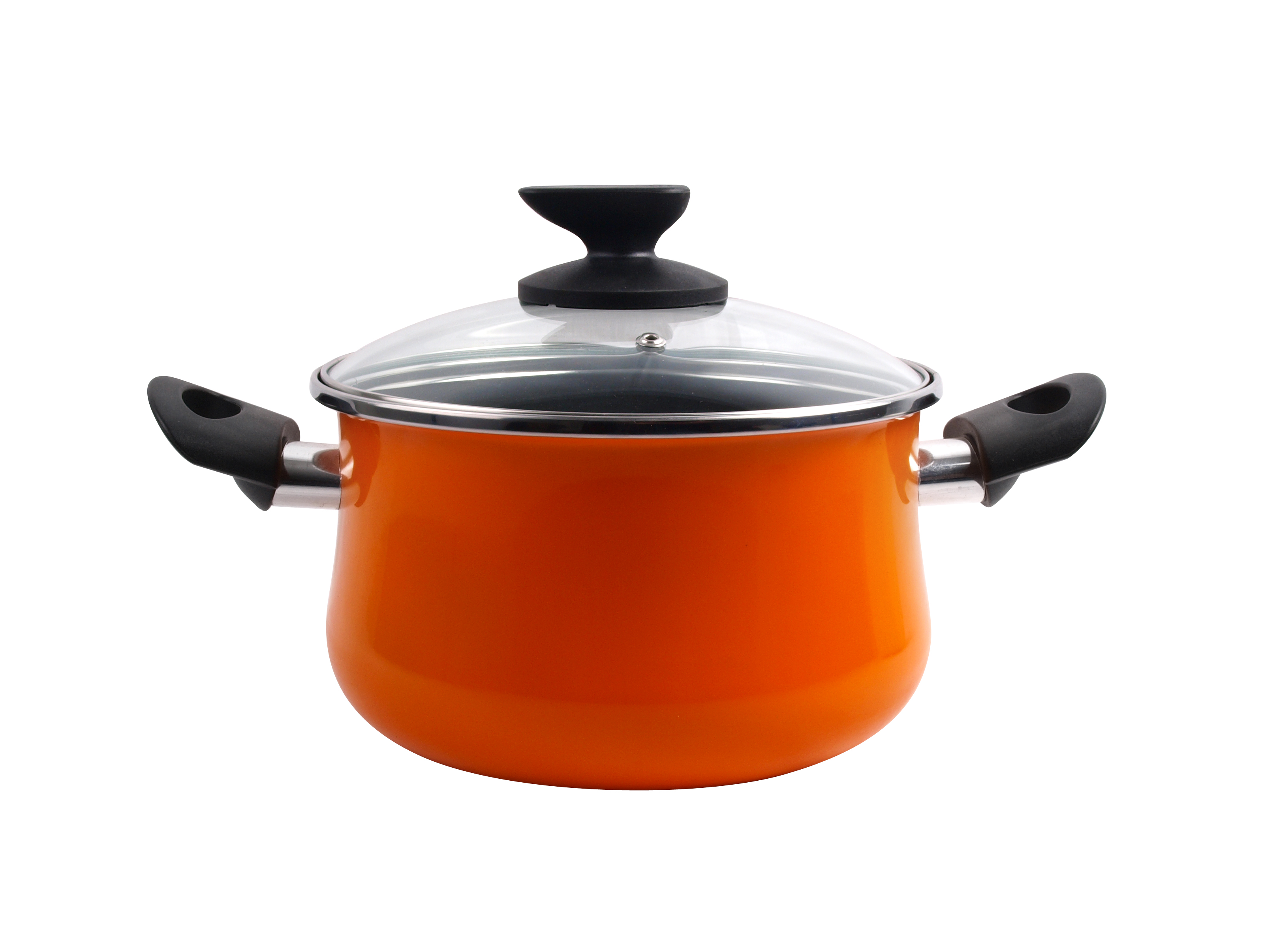 Acero esmaltado vitrificado. Color exterior naranja. Mangos y herrajes de baquelita. Tapas de vidrio con salida de vapor. Recubrimiento interior an- tiadherente BICAPA. Valida para todo tipo de fuegos.