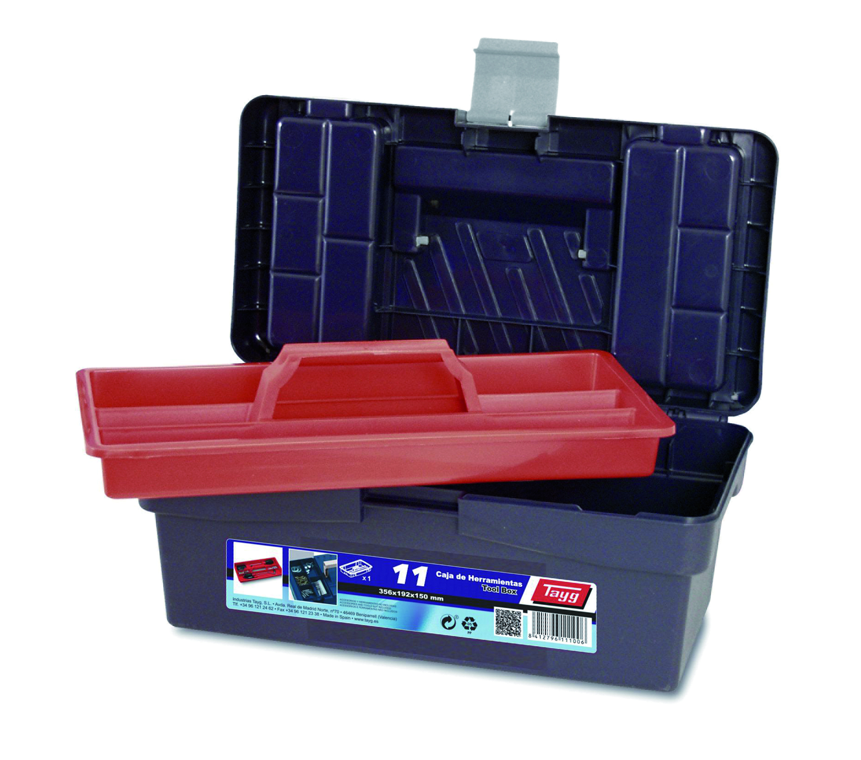 Caja de herramientas azul-roja. Medida: 356x192x150. Contiene 1 bandeja y 1 estuche.