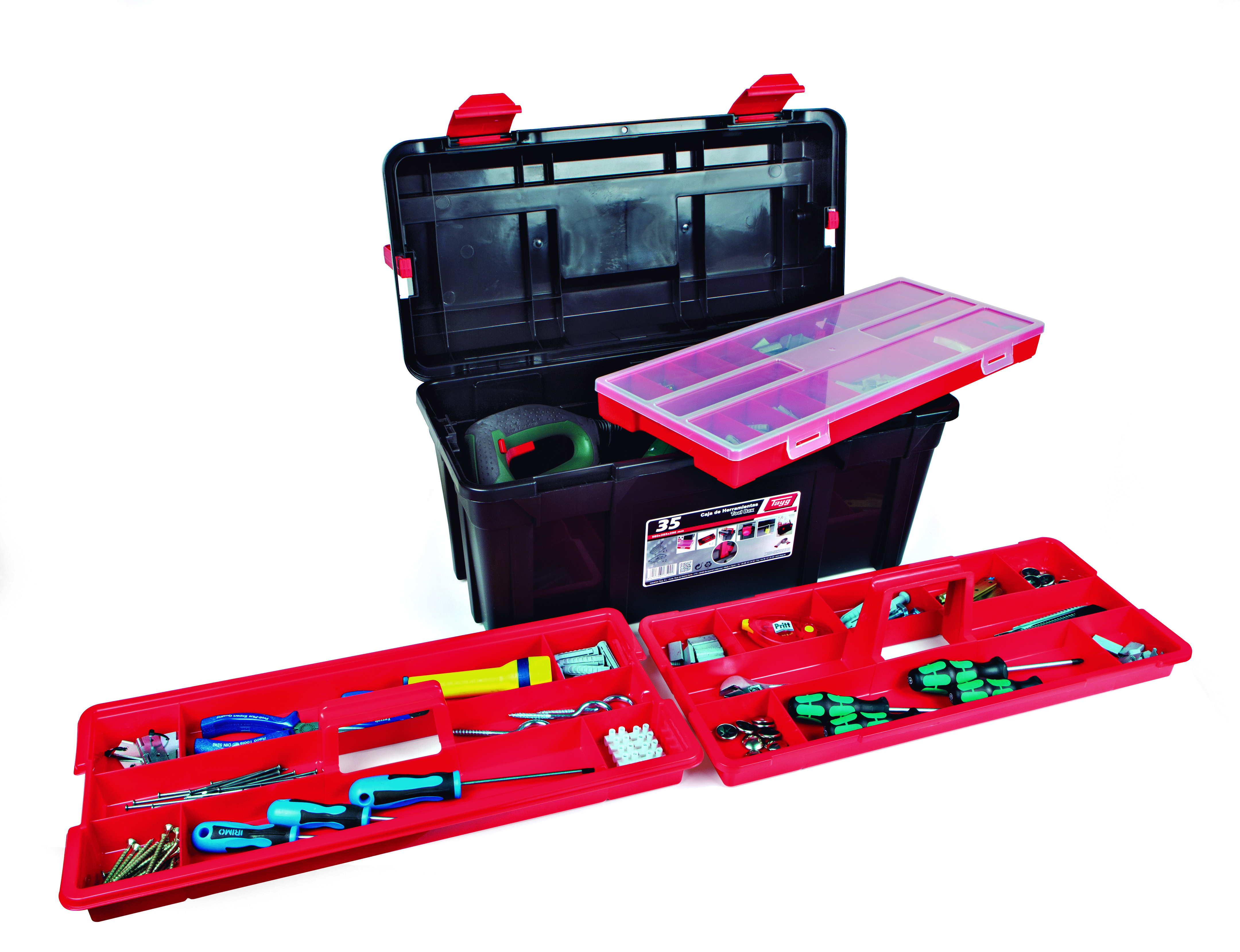 Caja de herramientas gris-roja. Medida: 580x285x290. Contiene 2 bandejas y 1 estuche.