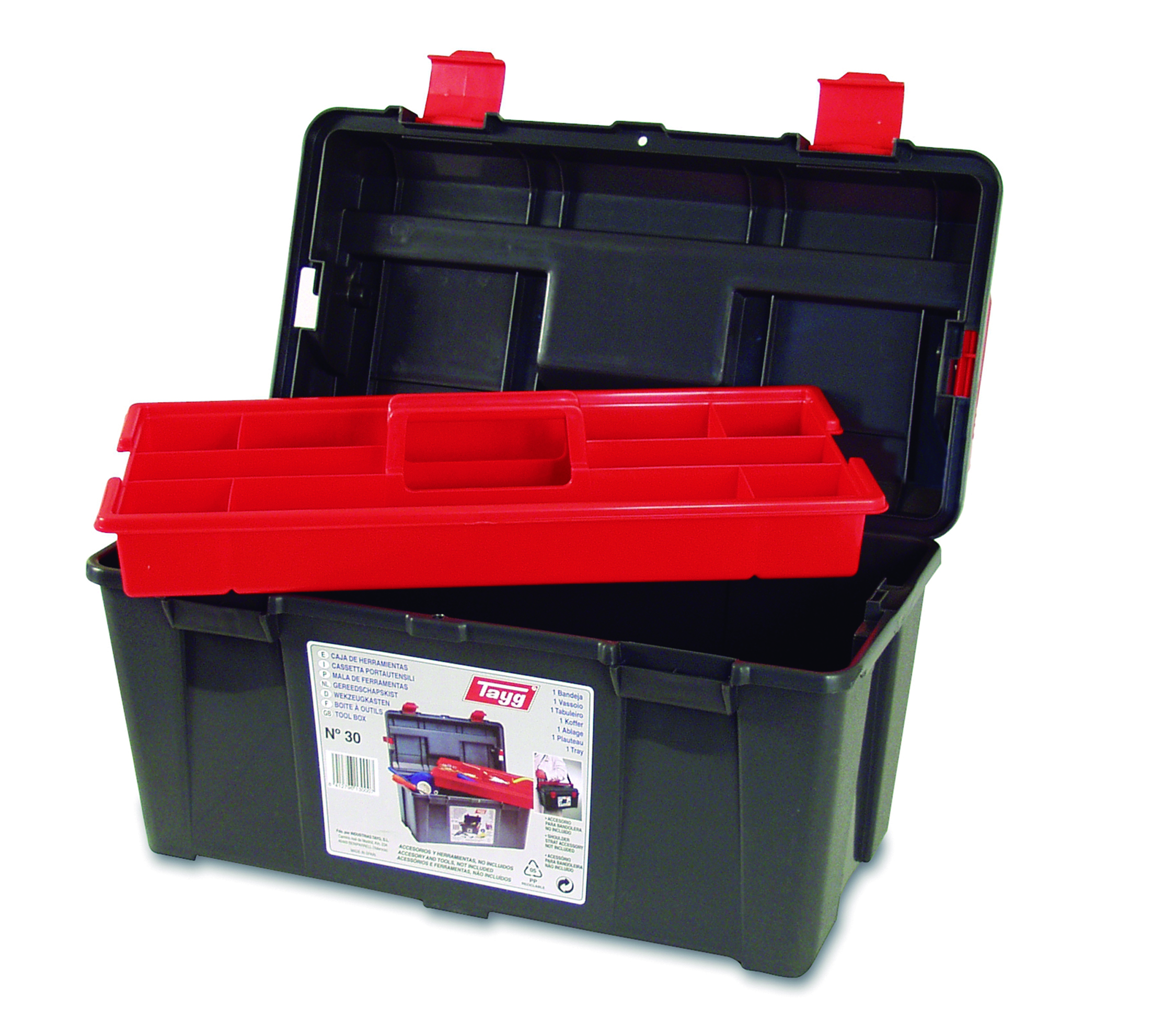 Caja de herramientas de plástico gris-roja. Medida: 445x235x230. Contiene 1 bandeja