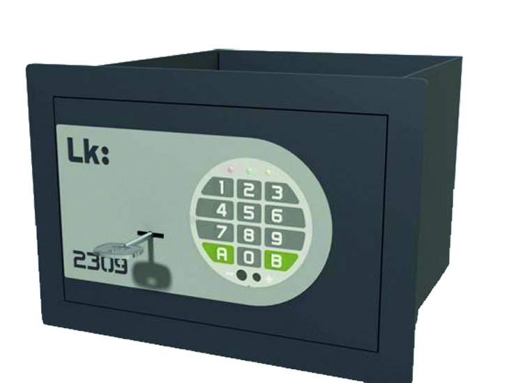 Caja fuerte empotrar 2309. Sistema de cierre movido por cerradura de gorjas. Bloqueo adicional por electroimán. Clave electrónica de 1 a 8 dígitos. Llave de emergencia ante olvido de clave. Contactos para batería externa ante agotamiento de pilas.Envolvente exterior de acero de 1,5mm. Puerta de acero de 6mm. Bisagra interior con sistema antipalanca. Bulones giratorios a un lado de acero de 20mm. Guías de deslizamiento de bulones en ABS en puerta. Alojamiento de bulones de ABS en cuerpo. Estantes regulables en 3 posiciones. Solapas antiextracción en trasera. Gama con 4 tamaños y 2 fondos. Caja en color gris RAL7021. Embellecedor en color plata RAL9006.