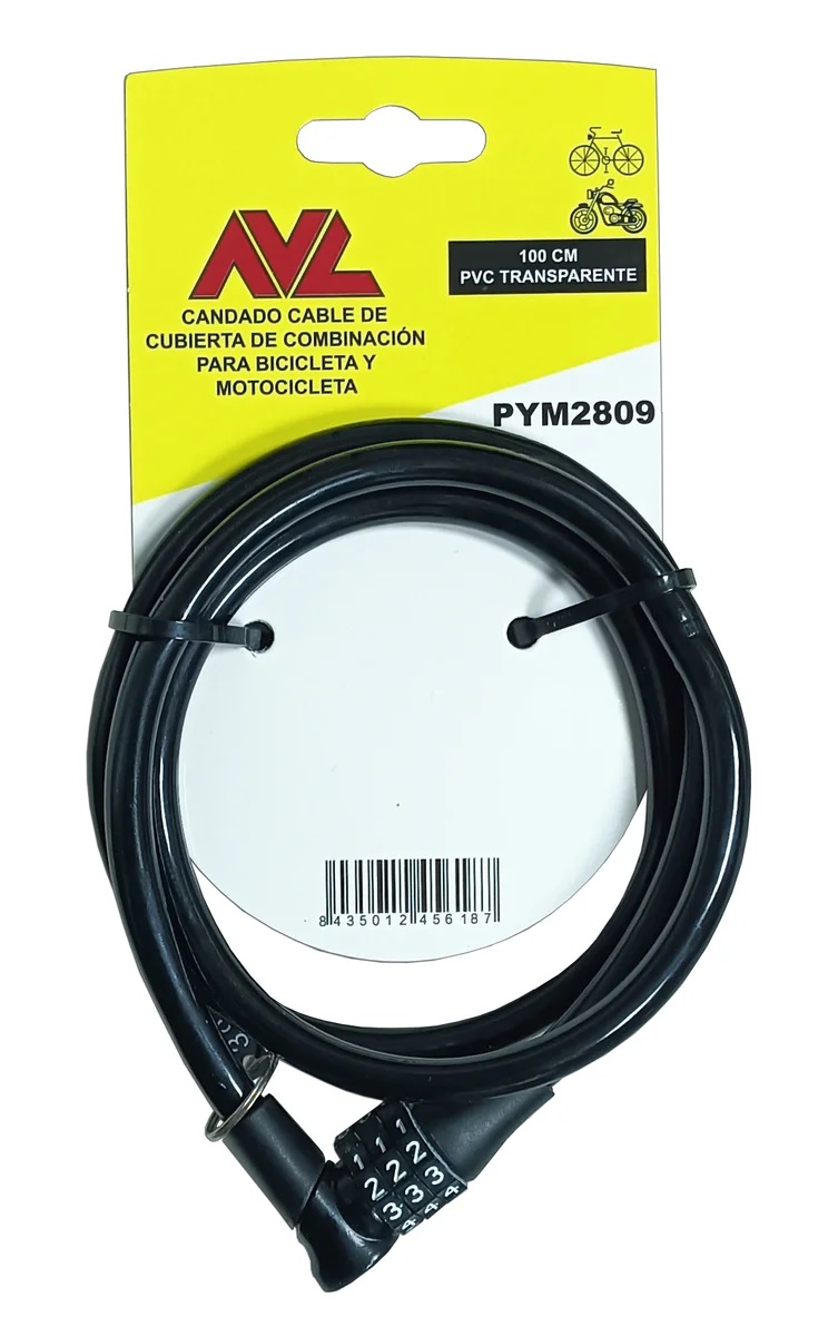 Candado de combinación. Cubierta de tubo negra, el diámetro del acero interior es de 4,5mm. Cabezal de bloqueo negro con combinación de 3 dígitos no reiniciables, cubierta de cabezal de bloqueo negra, números blancos.