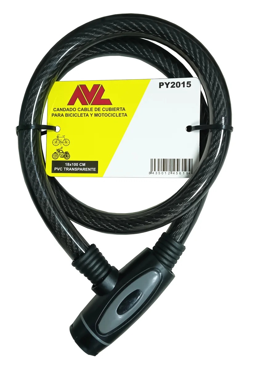 Candado con llave. Cable de cubierta de PVC transparente ahumado de 18mm, el diámetros del acero interior es de 18mm.Cubierta de plástico negro con lámina decorativa gris sobre el cabezal de la cerradura, tapa antipolvo en tapa negra, 2 llaves de latón.