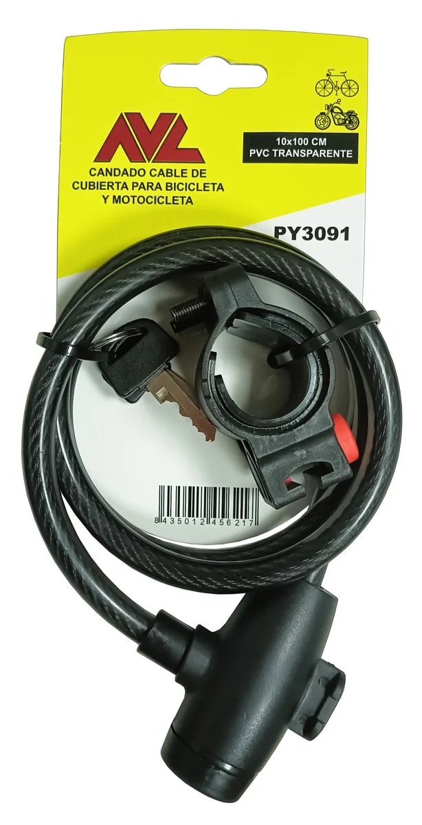 Candado con llave. Cable de cubierta de Pvc transparente ahumado de 10mm, el diámetro del acero interior es de 4,5mm. Cubierta de plástico negro sobre el cabezal de la cerradura, 2 llaves de latón.