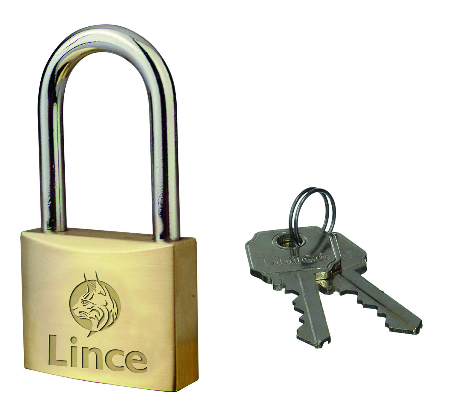 Candado serie 301 de latón TRADICIONAL. Candado arco largo. Ref.301-20. Medidas A=20, B=21, C=24, D=11, E=4 Y F=11. Pines 3. Llave mo- delo F, cantidad de llaves 2 und. Embalaje 12 und.