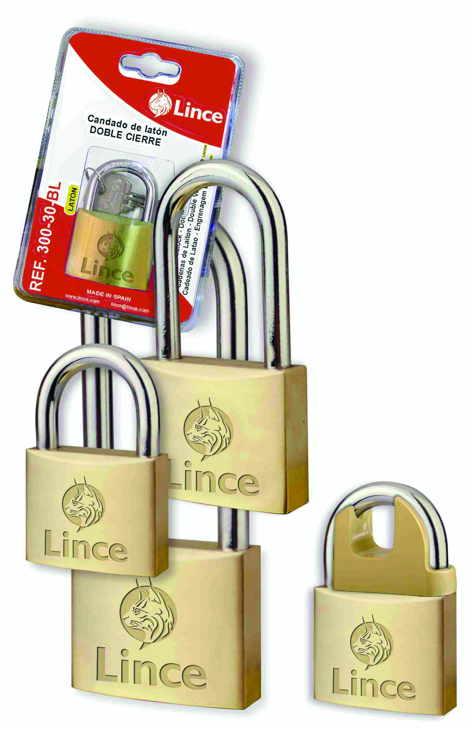 Candados serie 301 de latón TRADICIONAL.Candado arco largo, llave serreta. Ref. 301-30. Medidas A=30, B=32, C=30, D=16, E=5 Y F=13,5. Pines 5. Lave modelo D1, cantidad de llaves 2 und. Envalaje 12 und.