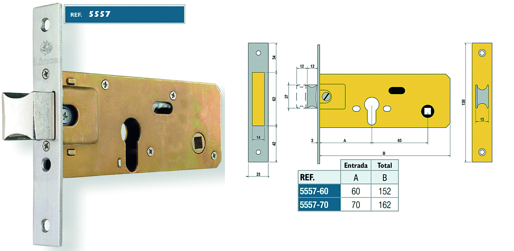 Cerradura para embutir en puertas metálicas. Frente acero inox. Cilindro C053030N. Cerradero no. Leva Larga. Con cilindro tradicional.
