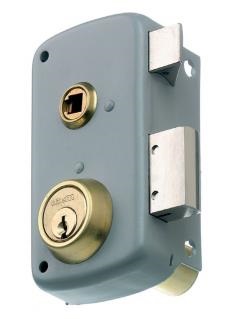 Cerradura de sobreponer con doble cilindro. Cilindro por ambos lados. Cerradura de sobreponer con palanca y picaporte. Palanca a dos vueltas. Caja y cerradero de acero embutido sin cortes, mayor solidez. Picaporte no reversible, la cerradura guarda mano. Cilindro por lado interior de latón redondo (2556BPR) o de perfil (2556BP). 3 llaves. Funcionamiento: El picaporte se acciona mediante manilla por ambos lados. Posibilidad de amaestrar toda la gama. Acabado pintado gris. ENVASE, UNIDADES POR CAJA: 20