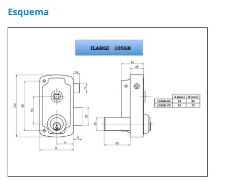 1056B CERRADURA SOBREPONER CILINDRO - Cerradura con cilindro ambos lados - Cerradura con palanca y picaporte - Palanca accionada con llave por ambos lados. Palanca a una vuelta - Picaporte accionado mediante manilla ambos lados - Cilindro con 3 llaves - Acabado en Hierro Esmaltado Alta Resistencia - 2 medidas de caja: 60 y 70 mm. - Bombillo Redondo (50-LP) - Medidas especiales bombillo redondo (50-LP) - Posibilidad de igualación de bombillos Tamaño Caja 60 mm. 70 mm. Mano Derecha Izquierda Bombillo Redondo (50-LP) Tamaño Bombillo 50 mm. Bombillos Espec. De 35 a 90 mm. Embalaje Unitario 1 Embalaje Caja 20