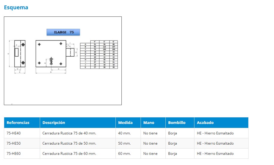75 CERRADURA RUSTICA - Cerradura Rustica de sobreponer con palanca - Cerradura sin cañón - Palanca accionada con llave por ambos lados. Palanca a dos vuelta - 1 llave de borja - Acabado en Hierro Esmaltado Alta Resistencia - 3 medidas de caja: 40, 50 y 60 mm. - No tiene mano Tamaño Caja 40 mm. 50 mm. 60 mm. Mano No tiene mano Cañon No Embalaje Unitario ( 40 / 50 / 60 mm. ) 4 / 4 / 4 Embalaje Caja ( 40 / 50 / 60 mm. ) 120 / 80 / 64