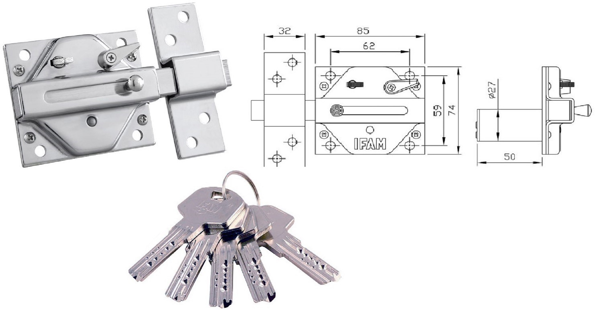 Cerrojo cuerpo de acero. Condena de palanca desde el interior. Esta opción es desactivable, si el cliente así lo requiere debe especificarlo en su pe- dido. Disponible con cilindro y sin cilindro. Utilizable para puertas de apertura izquierda o derecha. Acabado latonado y niquelado brillo. Palanca de acero cromoda, cuadrado 17mm. En la versión con cilindro se suministra con 5 llaves de la serie M. Combinable con cilindros serie RX y candados HUN080.