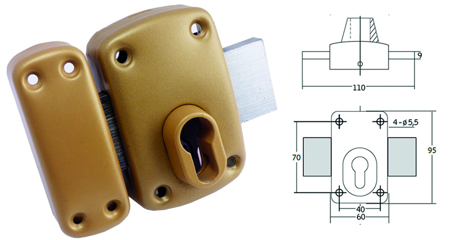 Cerrojo X5. Cerrojo de seguridad, adaptable a cualquier cilidro europerfil. Cuerpo y cerradero de acero. Acabado pintura epoxi. Palanca de 110mm y 2 vueltas. Utilizable para puertas de apertura izquierda o derecha. Ideal pa- ra puertas que requieren cambiar el cilindro frecuentemente. Combina con cilindros WX, RX, D y C. Cilindro no incluido.
