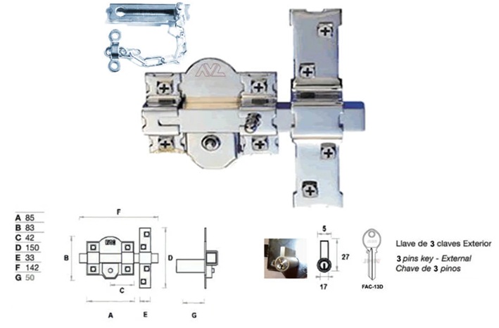 - ACABADO NIQUELADO - BARRA EN ACERO CALIBRADO 18 MM - PLACA EN ACERO 2 MM - CERRADERO EN ACERO 3 MM - CON CADENA 50 MM - CILINDRO LATÓN DE 50 MM DE LONGITUD - USA LA LLAVE JMA FAC-13D.