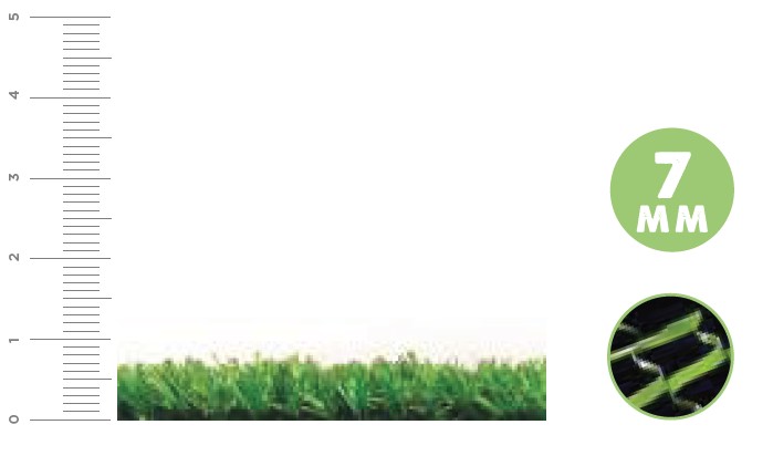 Césped Artificial 7mm rollos de 1x5m. Muy resistente y fácil de limpiar. Moqueta 7 mm de fibra fibrilada en color verde prado. Un césped multiusos, altamente resistente al tránsito.
