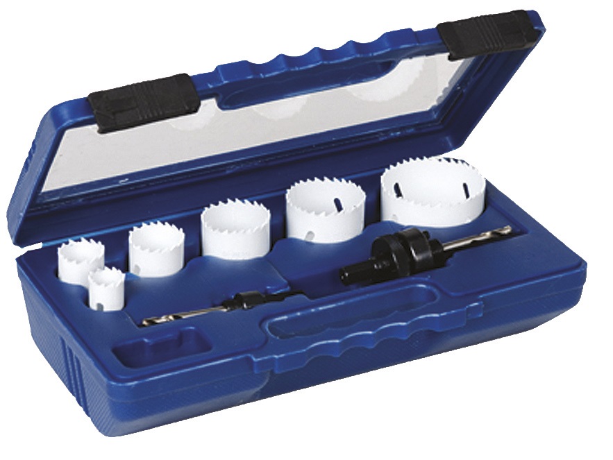 Contenido: 1 corona de las siguientes medidas: 7/8"(22 mm), 1-1/8(29 mm), 1 -3/8"(35 mm), 1-3/4 (44mm), 2"(51mm), 2-11/16" (68mm) 2 husillos: a)cilíndr ico de 1/4", rosca de 1/2"-20UNF, para coronas desde 9/16" hasta 1-3/16" de diámetro. b)hexagonal de 3/8", rosca de 5/8"-18UNF, para coronas desde 1-1 /4" a 7-7/8" de diámetro y un adaptado