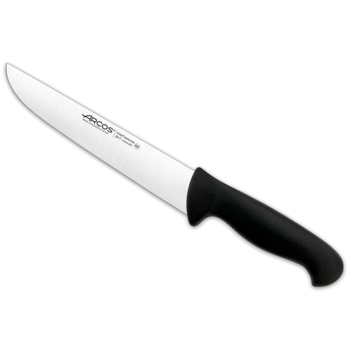 CUCHILLO CARNICERO COLOR NEGRO SERIE 2900 210 MM. Cuchillo grande de hoja ancha, filo liso, estable y muy fuerte. Utilizado por los carniceros para el despiece.Hoja de acero inoxidable Nitrum®, proporciona un filo estable y duradero. Mango de polipropileno inyectado, un material que evita los deslizamientos y tiene una gran resistencia a las altas temperaturas. El color del mango indicado el tipo de alimentos con los que debe utilizarse. De este modo, se evita la contaminación cruzada. Tiene un diseño ergonómico. Es apto para el lavavajillas.