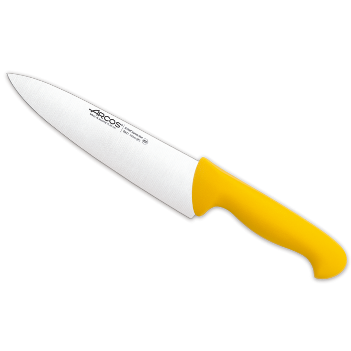 Este cuchillo cocinero amarillo Serie 2900 200 mm es la herramienta ideal para cortar verduras y carne con facilidad. Hoja de acero inoxidable Nitrum®, técnica exclusiva de Arcos que le proporciona una gran dureza y durabilidad. El mango del cuchillo es de polipropileno inyectado. Garantiza un agarre cómodo y seguro en todo momento. Presenta resistencia a las altas temperaturas (120-130ºC), los productos químicos y los golpes. El color del mango sirve para saber el tipo de alimentos con el que puede utilizarse. Impide la contaminación cruzadada.