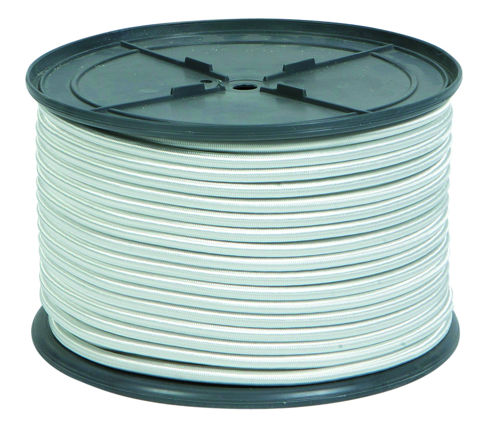Cuerda elástica trenzada en poliéster de alta tenacidad en su exterior para su resistencia a los rayos solares y con alma de látex de primera calidad, el cual le da la elasticidad adecuada para su uso en amarre de toldos, de lonas para camiones, remolques, piscinas, maquinaria agrícola, invernaderos, lonas publicitarias, pulpos. Desde 4 a 12 mm en rollos a 100 y 200 m. en color blanco.