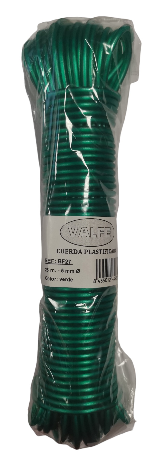 COMPOSICIÓN. Polietileno a 3 cabos. Recubierto en su totalidad por P.V.C. CARACTERÍSTICAS. Cuerda de fibra sintética, suave y resistente. UTILIDADES. Tendederos, persianas, toldos, campings. PRESENTACIÓN. Madejas de 10, 15, 20 y 25 mts.