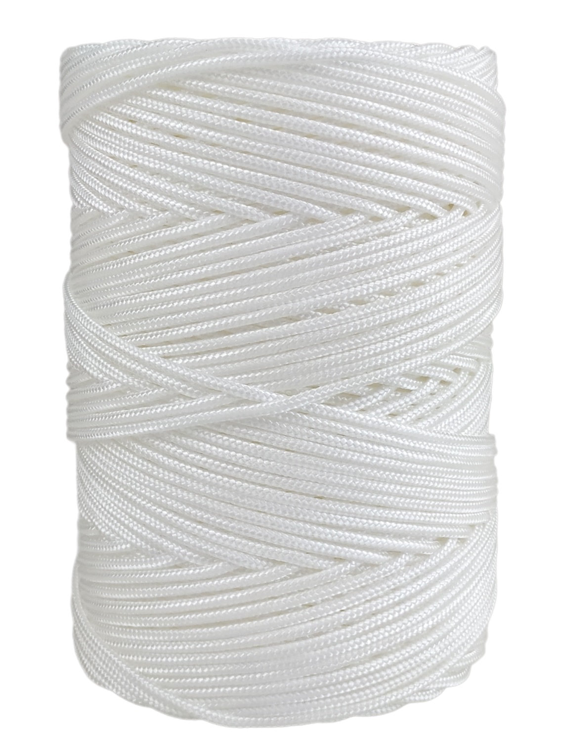 Riel redondo trenzado en su exterior de plástico de 3 m/m de diámetro y un relleno de poliéster texturizado. Es una cuerda semirrígida, ligera y resistente a la intemperie con poca elongación. Se presenta en bobinas de 200 metros de color blanco. Especialmente indicada para persianas, camping, rieles, jaulas, plomadas, cuerda guía, bricolaje y jardinería. Con una resistencia de 50 kilos aprox.
