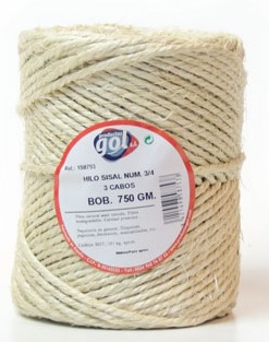 HILO SISAL NATURAL 3 CABOS 3.5 MM 750GR. BOBINA 98MT. Fibra natural biodegradable sisal torcido a diferentes cabos. Flexible, buena resistencia al nudo, poca elasticidad. No se deshace. Multiples aplicaciones. Paquetería en general, artesanía, agricultura, manualidades, decoración, comercio, bricolaje. Color: Natural. Modelo/Calibre: 1 cabo/2.0 mm., 2 cabos/2.5 mm., 3 cabos/3.5 mm. Medida: 25 mt., 45 mt., 80 mt., 98 mt., 150 mt., 295 mt. Presentación : Bobina. PRESENTA C I O N : B O B I N A (RETRACTILADO)