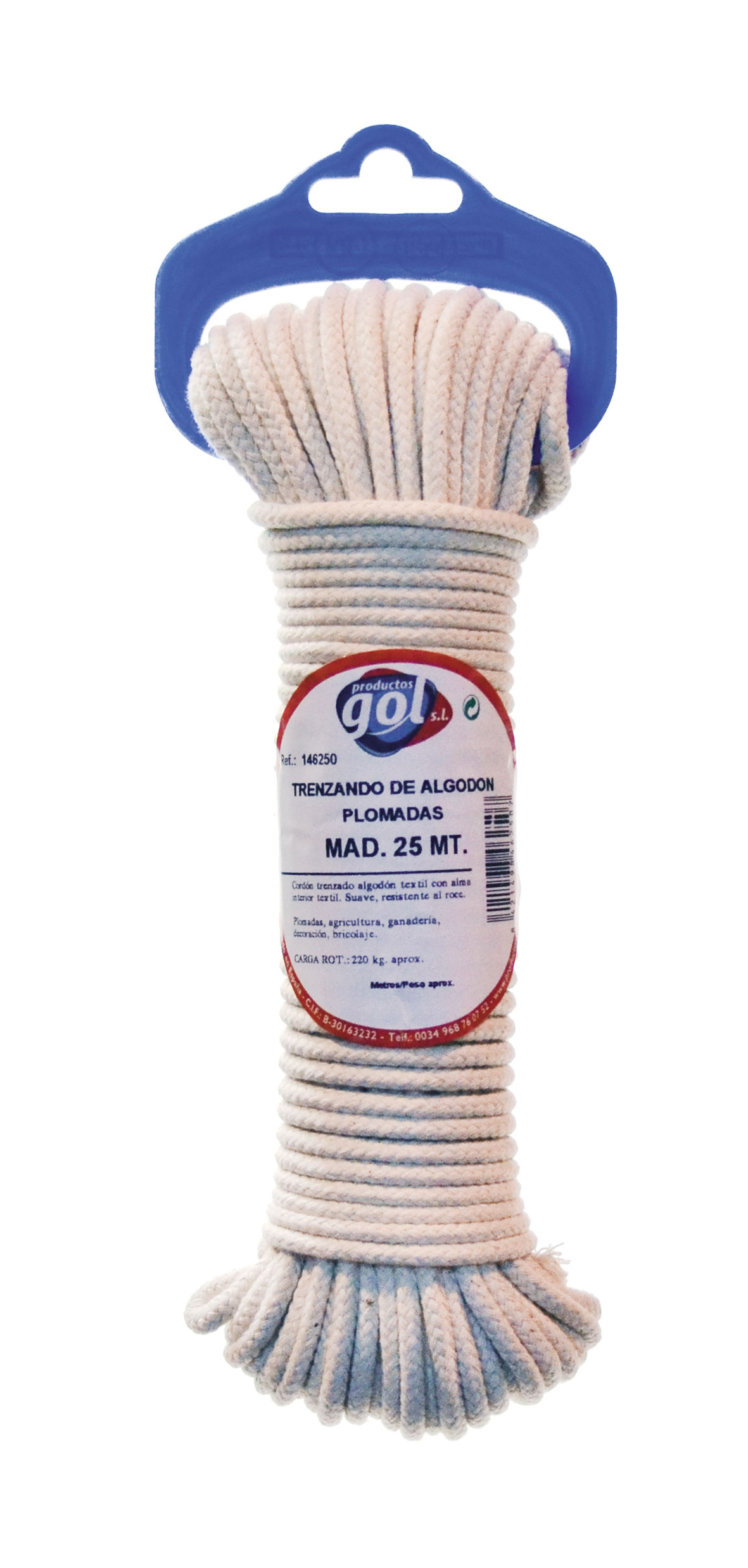 MADEJA TRENZADO ALGODON 15MT REF.146150 CORDON TRENZADO ALGODON NATURAL Multifilamento trenzado algodón con alma interior. Tacto suave, resistente al roce, flexible, buena resistencia. No se deshace. Agricultura, decoración, manualidades, plomadas, juegos infantiles, ganadería, industria, bricolaje. Color Natural. Calibre 4.0 mm., 5.0 mm., 6.0 mm., 8.0 mm., 10.0 mm., 12.0 mm., 14.0 mm., 16.0 mm., 18.0 mm., 20.0 mm. Medida 5 mt., 10 mt., 15 mt., 20 mt., 25 mt., 100 mt., 150 mt., 200 mt. Presentación Bobina, Carrete, Madeja, Rollo