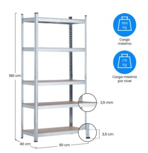 ESTANTERÍA GALVANIZADA 5 BALDAS AJUSTABLES 175KG. 1800x900x400mm