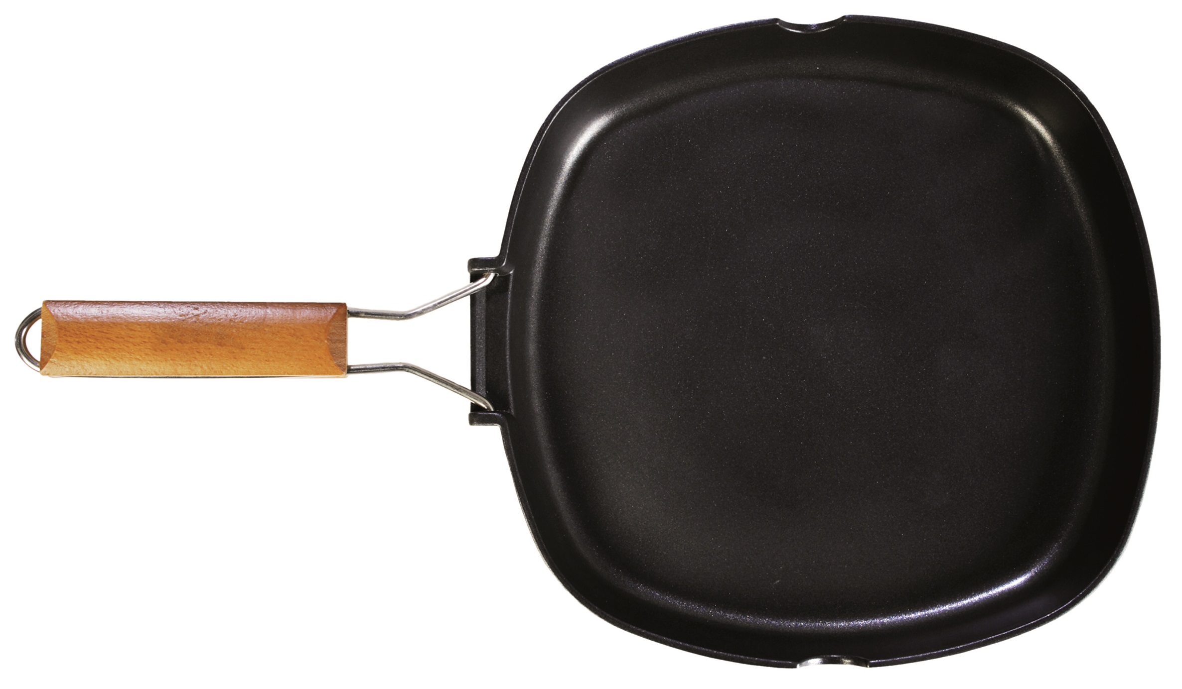 Espesor 5mm. Antiadherente interior ilag libre en PFOA, ecológico. Apta para todo tipo de cocinas incluida la inducción. Base de inducción completa. Mango de madera plegable. Med. 20x20cm.