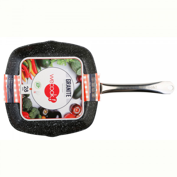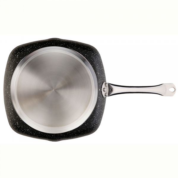 CARACTERISTICAS Espesor 3 mm. Antiadherente tipo piedra interior y exterior, ibre en PFOA, ecológico. Apta para todo tipo de fuegos, inducción y horno. Base de inducción. Mango de acero remachado en tres puntos para una máxima seguridad. Ø 28*28. «Marbel coating» antiadherente tipo piedra interior y exterior. Libre en PFOA. Apta para inducción.