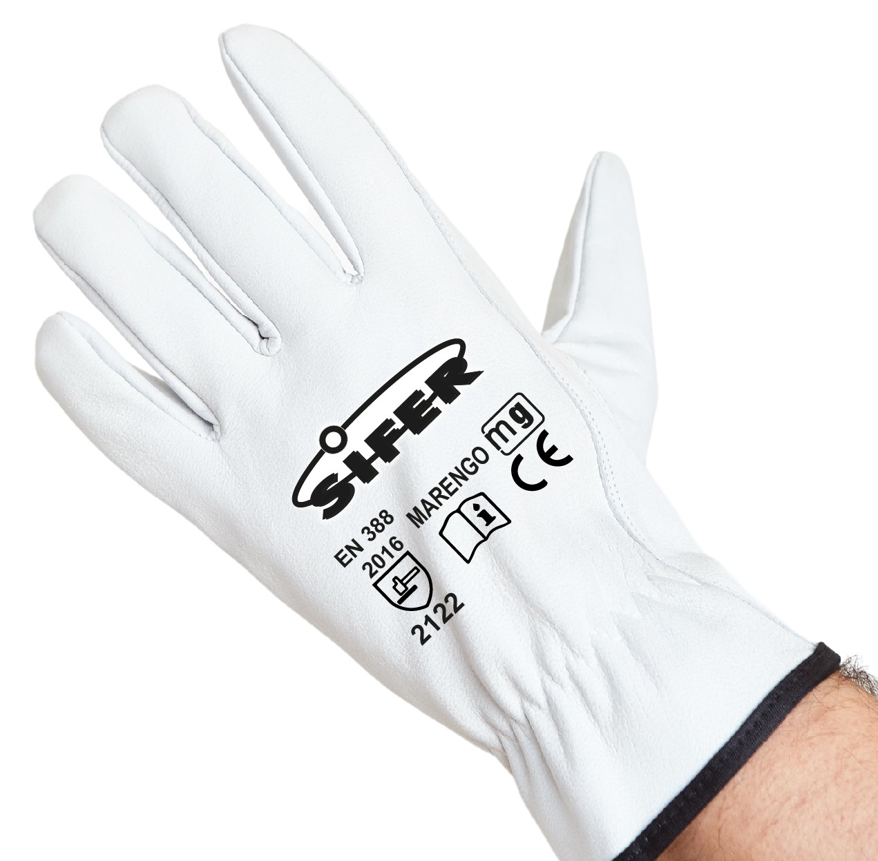 Guante piel ovino con doble cosido, pulgar reforzado. Manga elástica y reborde cosido. Color y relieve blanco. Material: piel flor ovino. Guantes de Piel flor ovino, diseñado para puesta y colocación rápida, manga con reborde y elástico, doble cosido y refuerzo en pulgar.