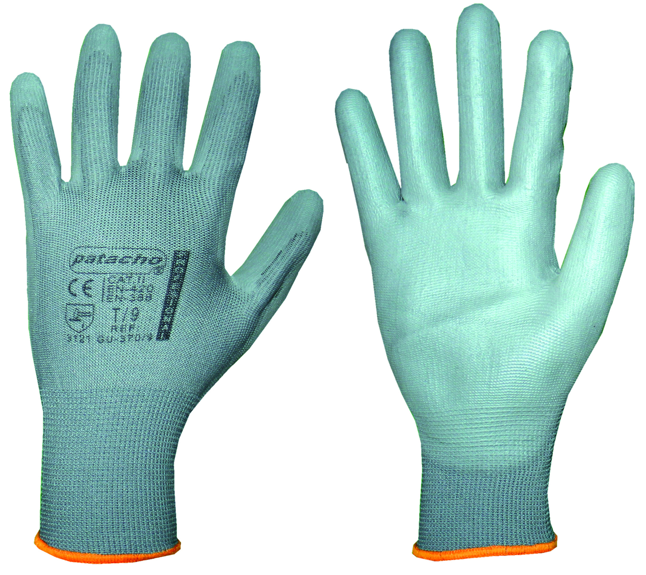 Guante de nylon sin costuras recubierto de poliuretano en la palma y los dedos. Dorso fresco sin recubrimiento, color gris. Recomendado para trabajos que requieren resistencia mecánica. Transporte, industria. etc. NORMA: EN420; EB388