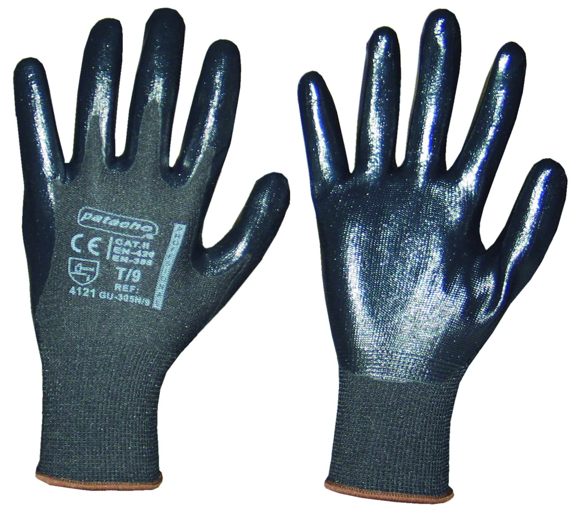 Guante nylon sin costuras recubierto de nitrilo de color negro en la palma y los dedos, dorso fresco sin recubrimiento. Recomendado para trabajos de precisión. Buen comportamiento para piezas grasientas. NORMA EN420; EN388 3.1.2.1
