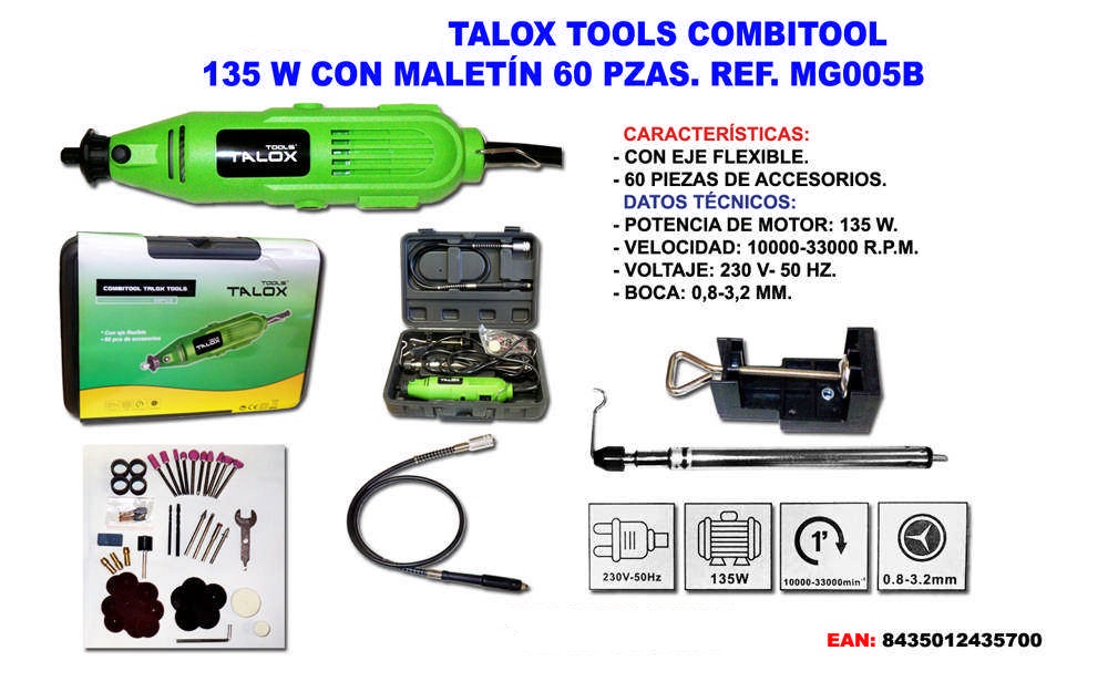 Con eje flexible. 60 piezas de accesorios. Maletin plástico. 230v. 135w. 10.000-33.000 r.p.m. 0,8-3,2 mm.