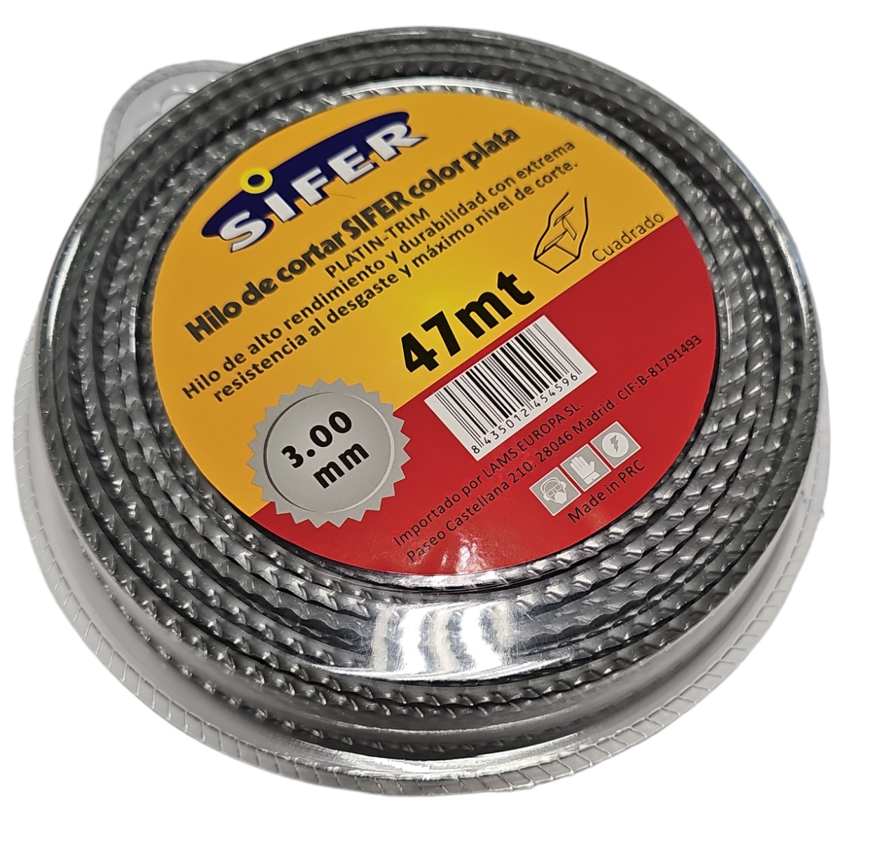 Hilo de cortar Sifer color plata PLATIN-TRIM. Hilo de alto rendimiento y durabilidad con extrema resistencia al desgaste y máximo nivel de corte. 3mm, Rollo 47mts. Hilo cuadrado.