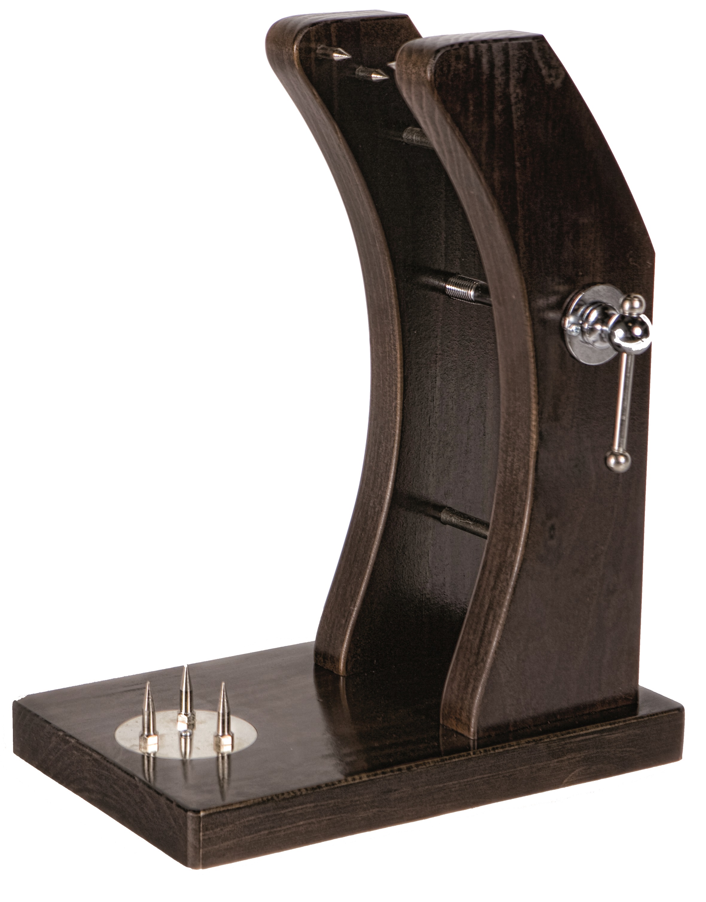Jamonero fabricado en madera de pino insigne chileno, lacado tabaco con herrajes y pinchos de acero cromado.