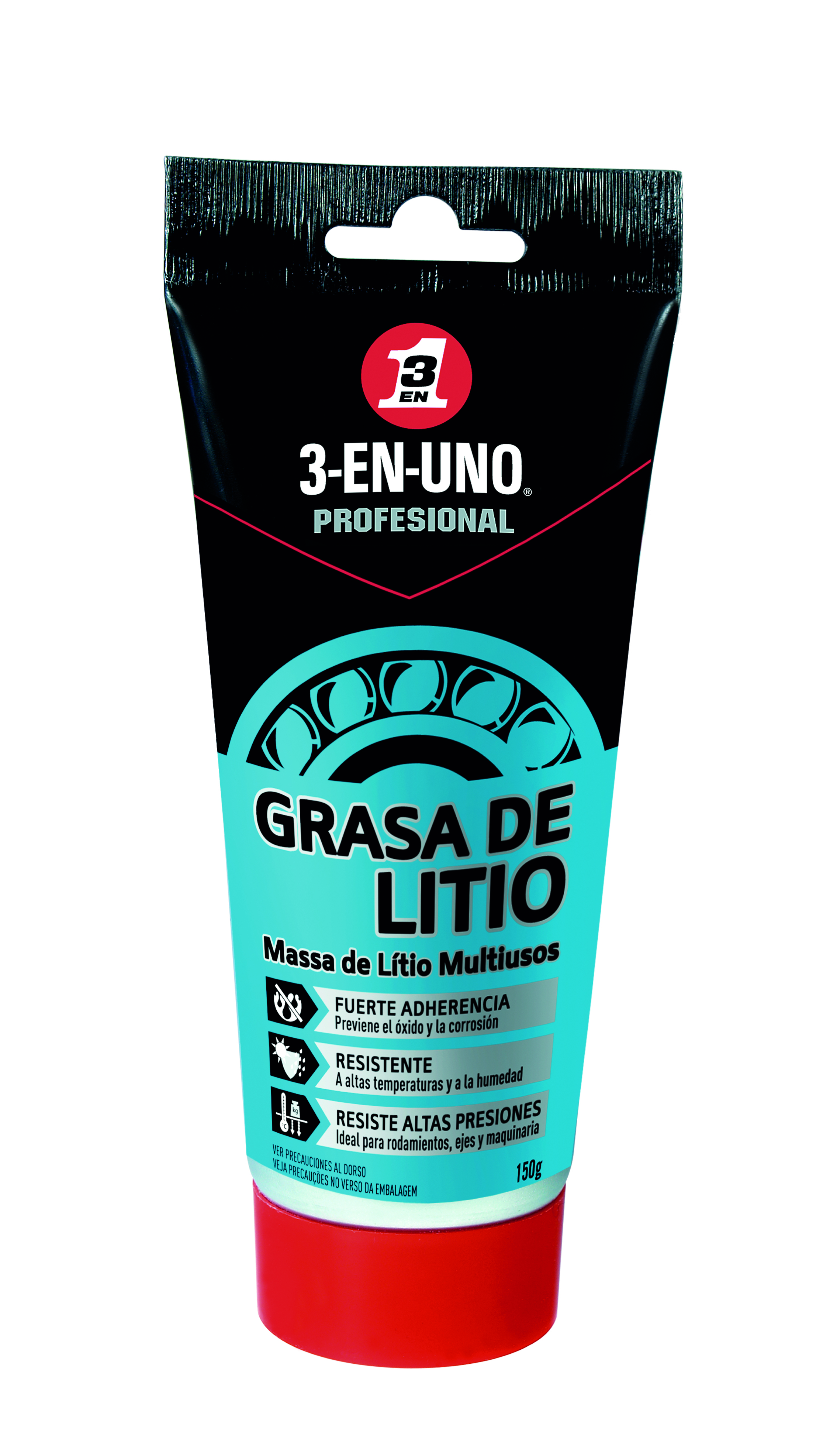 Grasa de litio 3 en 1 tubo 150 gr. La grasa universal de litio PROFESIONAL 3-EN-UNO garantiza una lubricación duradera de todos los mecanismos que ruedan, giran, se deslizan o encajan. Resistente al agua y a la presión, adaptado a las condiciones exteriores, reduce la fricción al mismo tiempo que protege contra el óxido y la corrosión. Es adecuado para cubos, rodamientos, rodillos, engranajes, bisagras de puertas, etc. Lubricación superior y de larga duración. Previene el óxido y la corrosión. Excelente resistencia a la presión. Clasificación NLGI*: grado 2. Resiste temperaturas de -20ºC a +140ºC. Resistencia al agua (test ASTM D1264) a 39º C %: 5. Punto Transformación a liquido: 190º Viscosidad a 40º: 110. Fuerte adherencia. Resistente al agua y al calor.