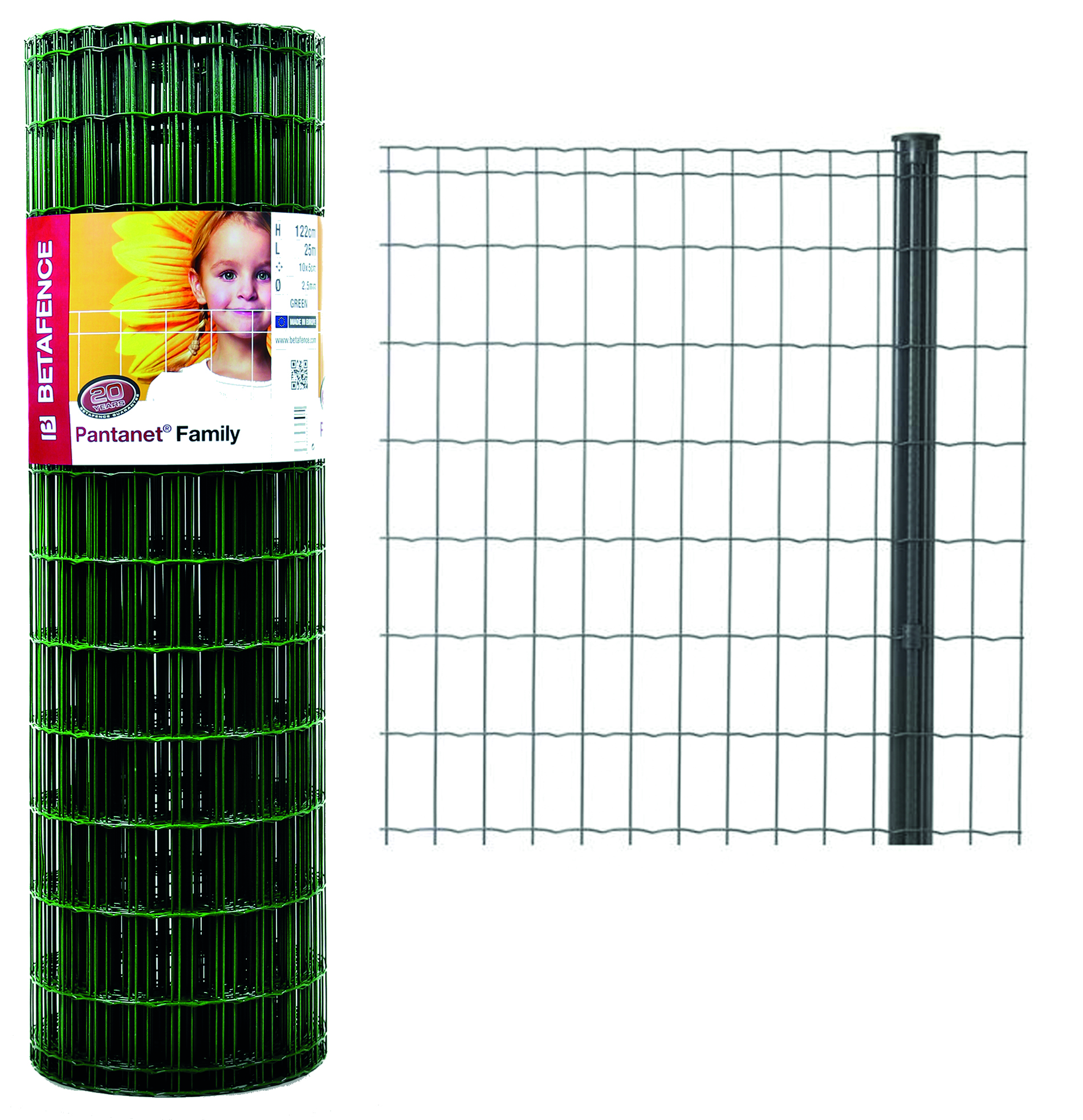 Pantanet Family Dimensión malla mm 101,6 x 50,8, Ø alambre horizontal 2,50, Ø alambre vertical 2,50, resistencia alambre horizontal 400 - 550 N/mm2, resistencia alambre vertical 750 - 950 N/mm2 Malla Mal la galvanizada, fabricada con alambre galvanizado, soldado y posteriormente plastificado. Los alambres horizontales tienen un goterón en cada malla. L a malla está reforzada en el extremo superior por un doble alambre a una di stancia de 25,4 mm (excepto Pantanet Light). Recubrimiento Los rollos están fabricados de alambres galvanizados. Un tratamiento de adherencia garantiz a una perfecta plastifi cación en PVC, en la superfi cie del producto. Los postes Bekaclip están galvanizados en el interior y exterior con una capa m in. 275 g/m2 (2 caras combinadas), según la norma Europea 10326. Galvanizad o y plastifi cado con poliéster con un espesor min. de 60 micras. Colores V allado verde RAL 6073 Postes verde RAL 6005 Puertas El sistema Pantanet se completa con la gama de puertas Fortinet o Robusta: puertas simples o doble s, giratorias o correderas.