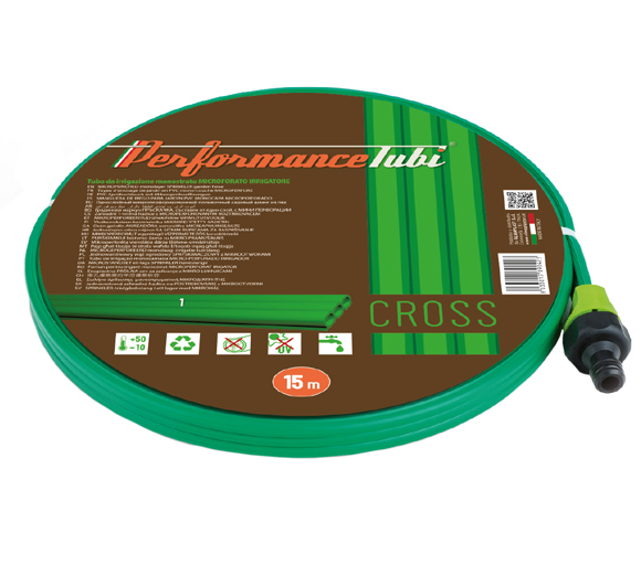 CROSS Microperforada Ø mm.-- 15 metros Tubo de riego provisto de 3 canales paralelos microperforados. Diseñado para obtener un riego vaporizado uniforme “micro rain”. Invirtiendo el tubo, puede ser utilizado para riego por goteo. Presión de utilización recomendada 4 bar. Ideal para pequeñas zonas verdes. Totalmente reciclable.