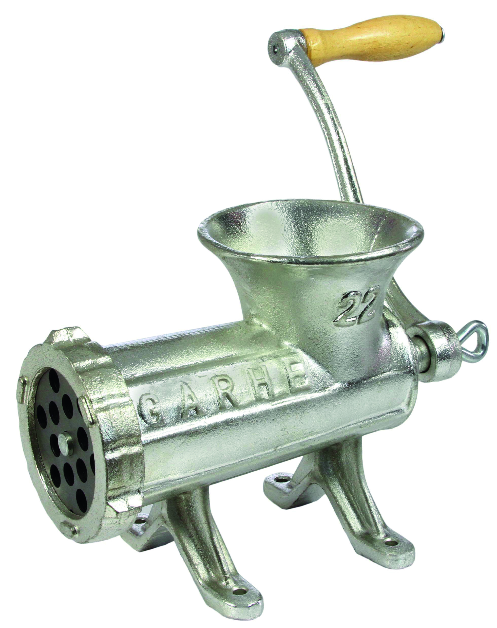 Cabezal, husillo, tuerca y manivela fabricados en hierro fundido, estañado en caliente. Cuchilla y placa fabricadas en acero estampado y templado. Máquina tradicional de sujeción mediante tornillos que responden a los requerimientos más estrictos de trituración. Permite acoplar una tolva, de manera que respetando el ancho de la boca se garantiza una seguridad total y a la vez se aumenta aún más la producción al poderse cargar más carne.