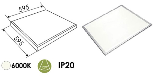 Medida 600x600mm. Led SMD 3014 high power. Voltaje 230VCA. Posibilidad de fijación a techo. Fuente de alimentación externa incluida. Vida estimada 30.000 horas. IP20 (para lugares sin humedad). Apertura luz 120º.