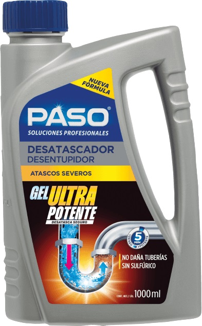 Paso desatascador gel express 1l. Todo tipo de tuberías, incluso las de PVC y desagües. Desatascador de tuberías con fórmula de gel super denso a base de sosa cáustica que consigue la solución más potente y rápida para desatascar por completo todo tipo de tuberías, incluso las de PVC y desagües, de forma cómoda, segura y sin salpicaduras. Sin ácido sulfúrico. No daña las tuberías. Apto para tuberías lentas o atascos severos.0% sulfúrico. 100% eficaz. Acción express : 5 min. No daña las tuberías