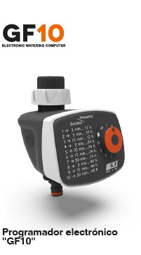 GF10 - Programador Electrónico con 10 programas de riego. Simplicidad, fiabilidad y diseño moderno, permite programar diferentes programas (10) a través del práctico selector de botón. Para ajustar la frecuencia y la duración del riego, gire el botón hasta el valor deseado. El riego comenzará 3 segundos después de la última rotación. • Coloque el selector en MAN para los arranques manuales fuera de los ciclos programados. • Funciona con pila alcalina de 9 voltios. • Dispositivo de corte del suministro de agua en caso de pila descargada. • Componentes eléctricos protegidos contra el agua y la humedad. • Conexión de grifo de 3/4". • Presión máxima de uso: 8 bares.