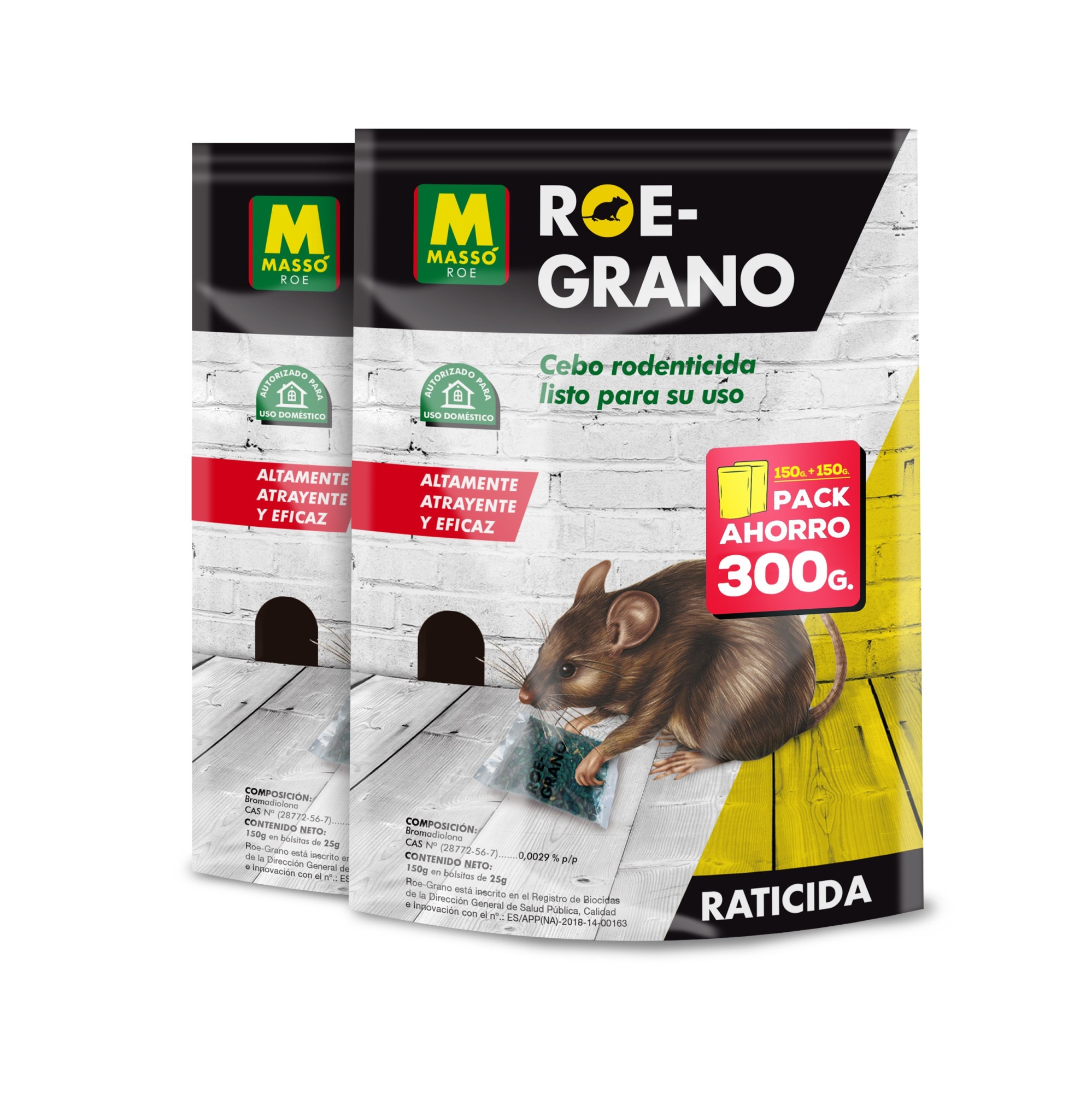 Roe Grano 150 gr+ 150 gr. (12 bolsitas de 25 gr). 231616. Cebo en bolsas en grano de cereal impregnado con bromadiolona. Raticida anticoagulante para el control de ratas y ratones jóvenes y adultos. Atrayente apetecible, eficaz y listo uso con portacebos. Uso en interior de viviendas de uso privado, en portacebos correctamente etiquetados. Contra rata parda o de alcantarilla, ratón común y demás roedores. Composición: bromadiolona 0.0029%.